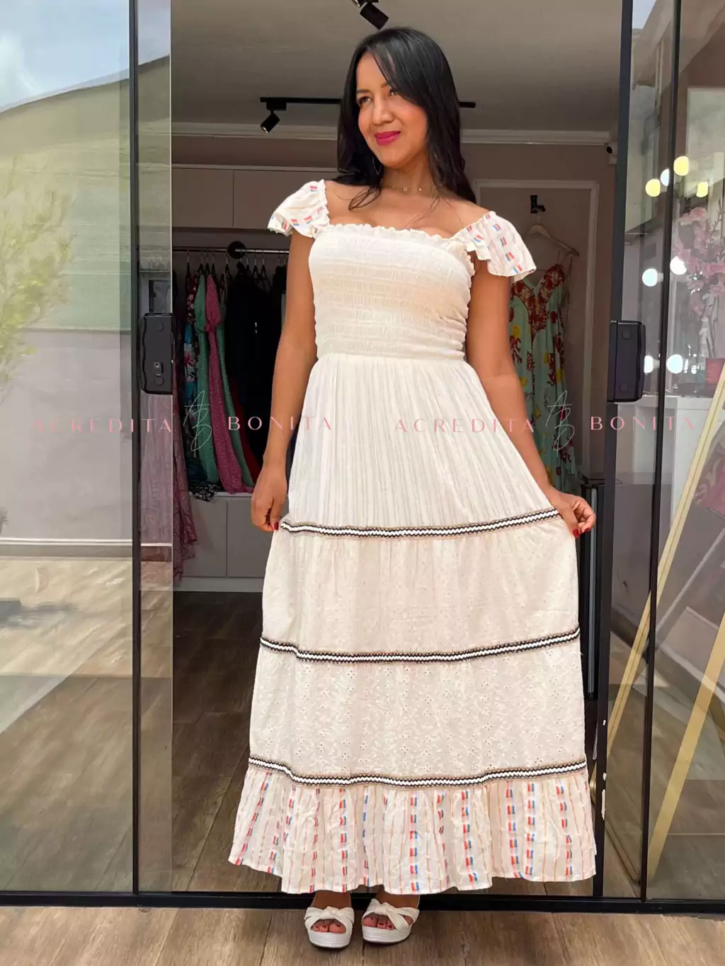 O Vestido Sofia é uma peça perfeita para o verão, confeccionado em 100% algodão, garantindo leveza e conforto. Ele apresenta um design elegante, adornado com detalhes artesanais nas mangas e na barra, que confere um charme ao visual. No busto e na cintura possuem lastex que se estende até as costas, destacando a silhueta de maneira delicada.